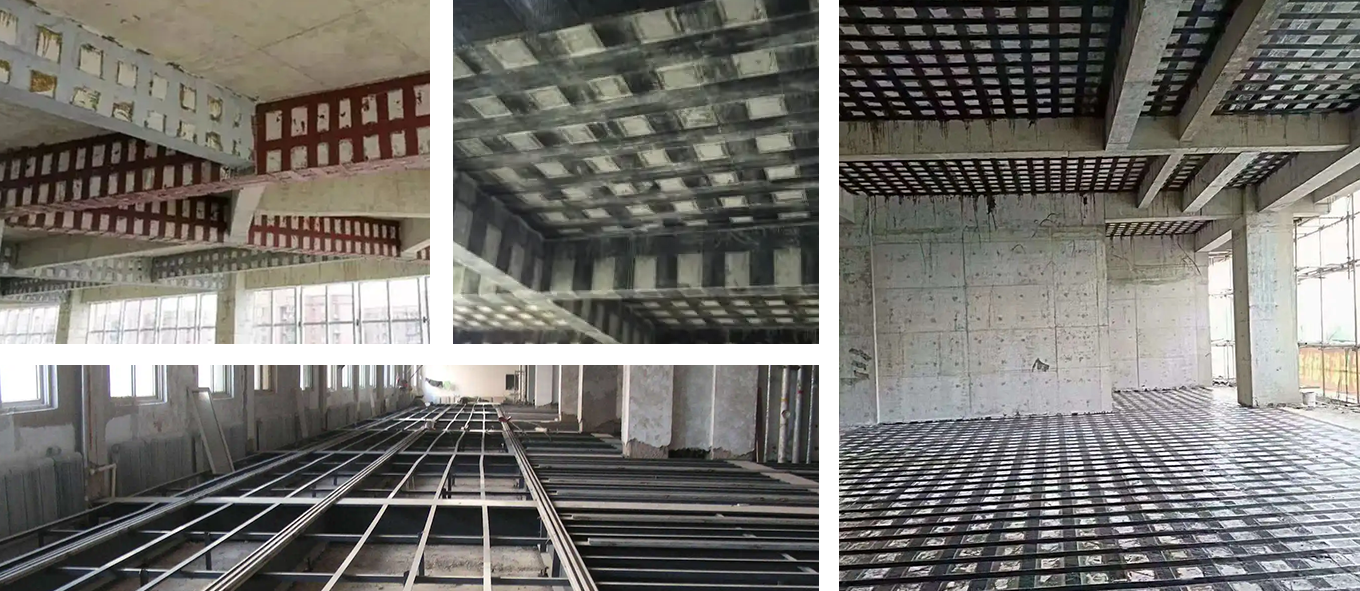 全工艺应用: 顶升平移、纠偏、托梁拔柱提载等综合性加固工程以及增大截面、预应力、碳布碳板、粘钢包钢裂缝蜂窝、植筋、裂缝注浆、切割拆除置换等基础应用。