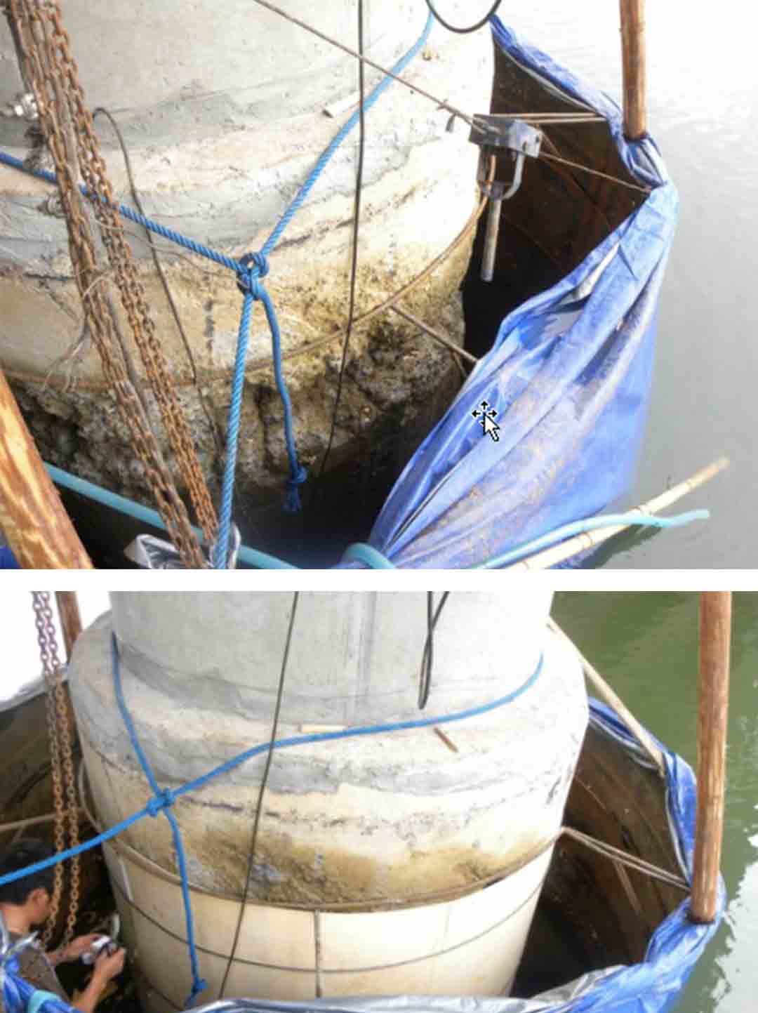 概况:水库大桥,水库水位下降。发现部分桥墩出现大面积蜂窝,钢筋外露,需进行加固处理。处理方案:该桥墩水深8米,如采用水库降水法进行加固施工,势必会影响水库发电厂的正常发电工作,且对电厂每日造成高达3万元的经济损失。为了不影响电厂正常运营,我司采用钢护筒排水法,成功对该工程缺陷部位进行混凝土置换、外粘贴碳钎维布加固。